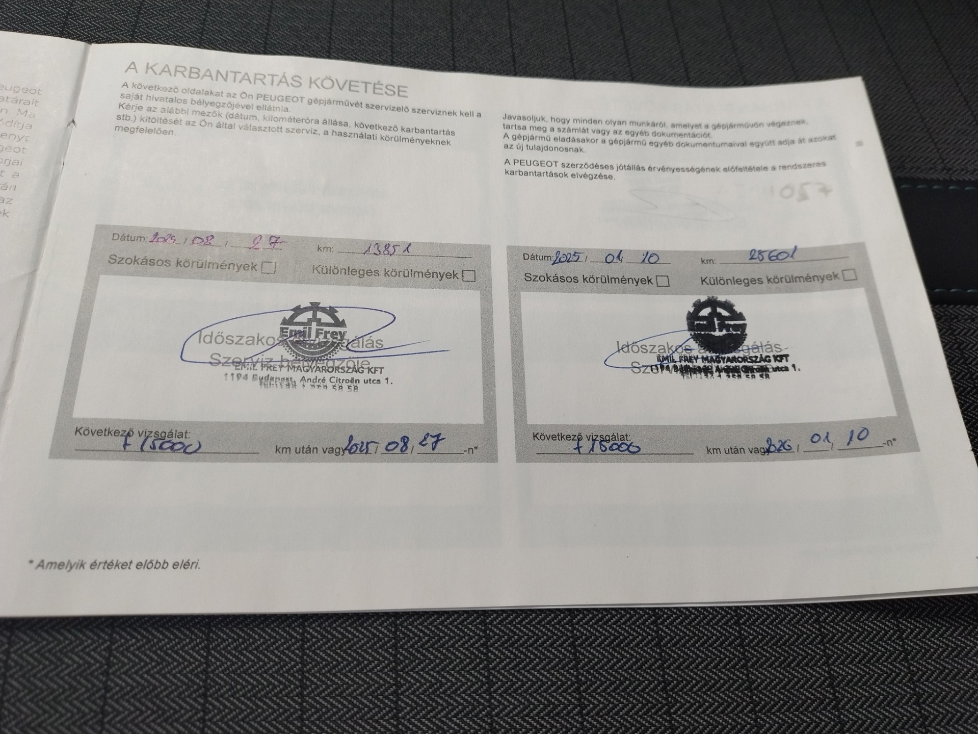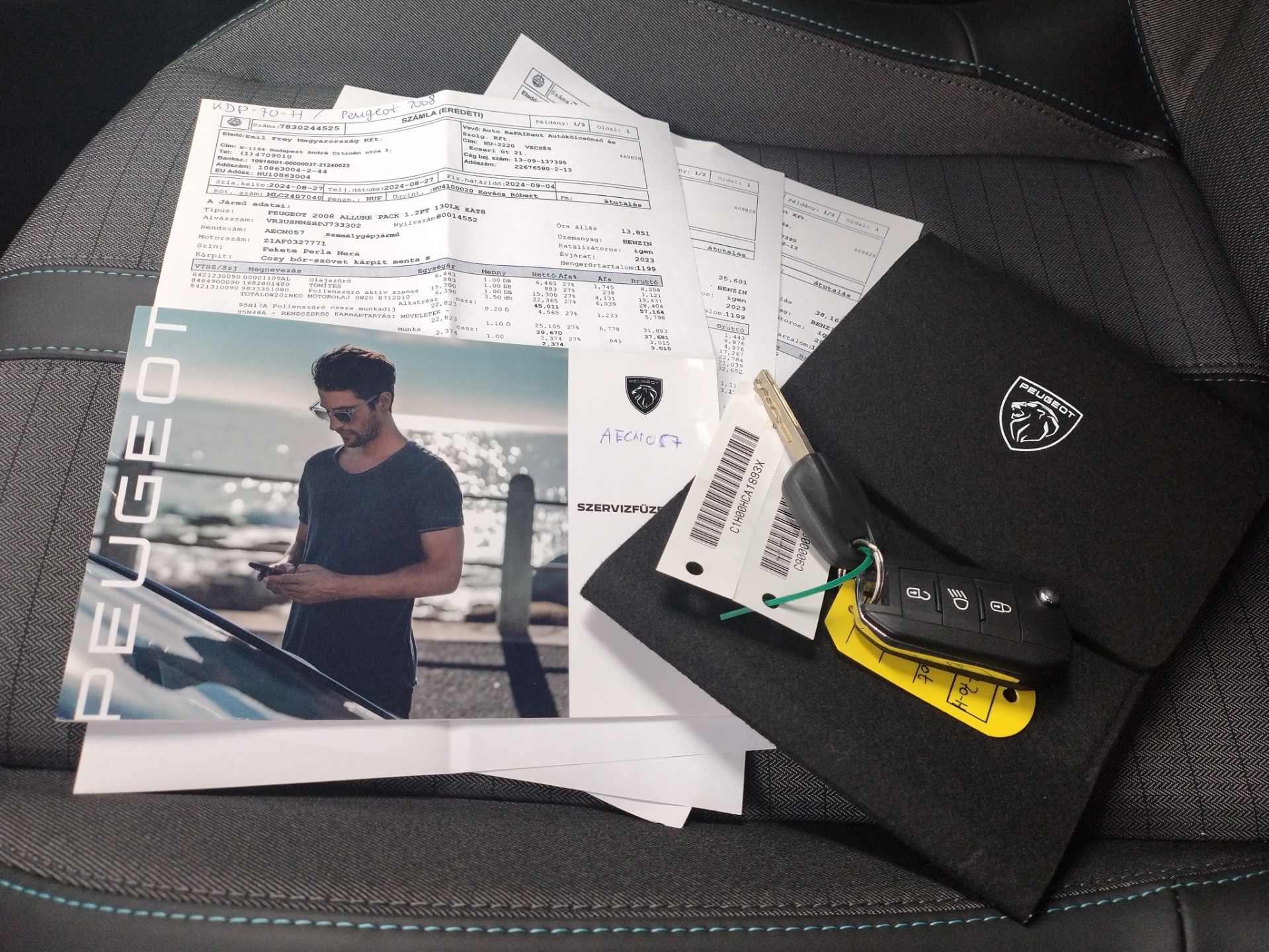De onderhoudsboekjes zijn aanwezig en gestempeld, en ook de onderhoudsfacturen zijn aanwezig. De onderhoudshistorie ziet er als volgt uit. Er is onderhoud uitgevoerd bij 13.851 km op 27-8-2024 (o.a. motorolie, oliefilter en interieurfilter vernieuwd), bij 25.601 km op 15-1-2025 (o.a. motorolie, oliefilter, bougies, interieurfilter, luchtfilter en remvloeistof vernieuwd), en bij 38.167 km op 17-9-2025 (motorolie, oliefilter en interieurfilter vernieuwd).
